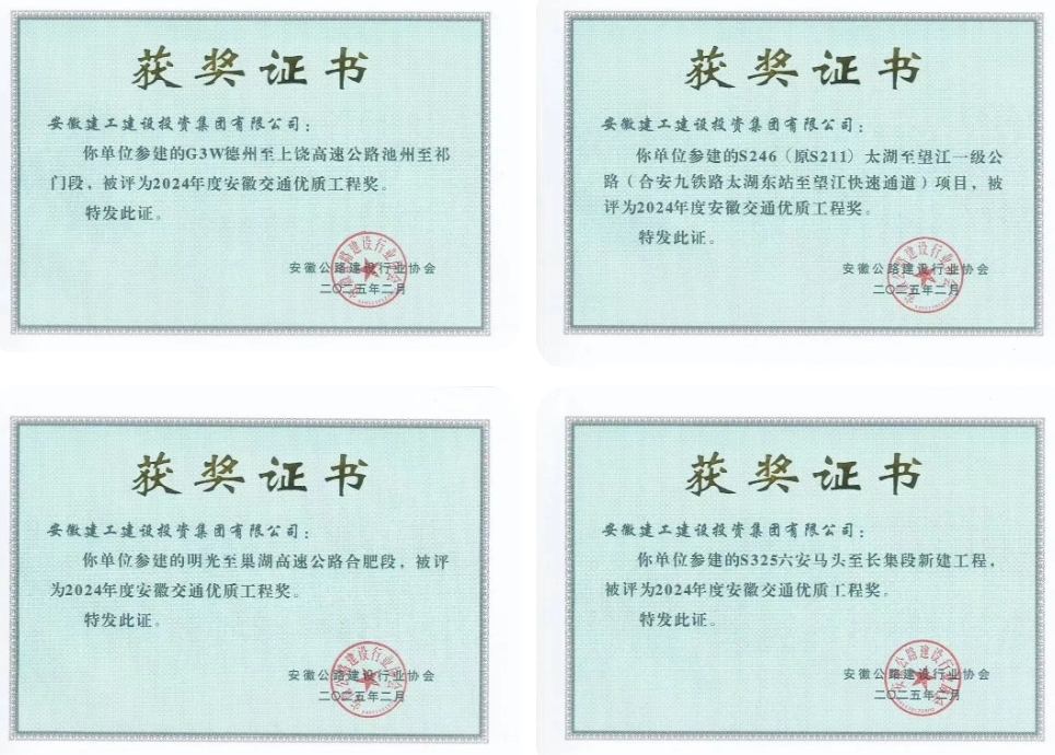 2025年6月17日,安徽公路建設(shè)行業(yè)協(xié)會(huì)第五次會(huì)員代表大會(huì)暨2024年度安徽交通優(yōu)質(zhì)工程獎(jiǎng)?lì)C獎(jiǎng)大會(huì)在合肥召開(kāi)。建工建投公司憑借卓越的工程建設(shè)能力,榮獲四項(xiàng)安徽交通優(yōu)質(zhì)工程獎(jiǎng)!