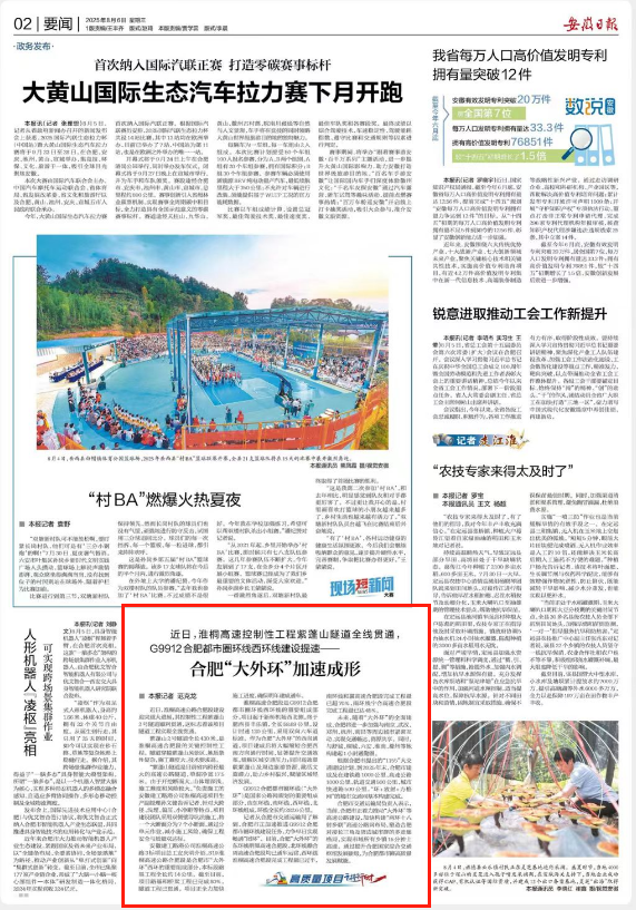 8月6日,安徽日報以“近日,淮桐高速控制性工程紫蓬山隧道全線貫通,G9912合肥都市圈環(huán)線西環(huán)線建設(shè)提速——合肥'大外環(huán)'加速成形”為題,專題報道了由建工路港公司承建的淮桐高速項目建設(shè)進展情況。