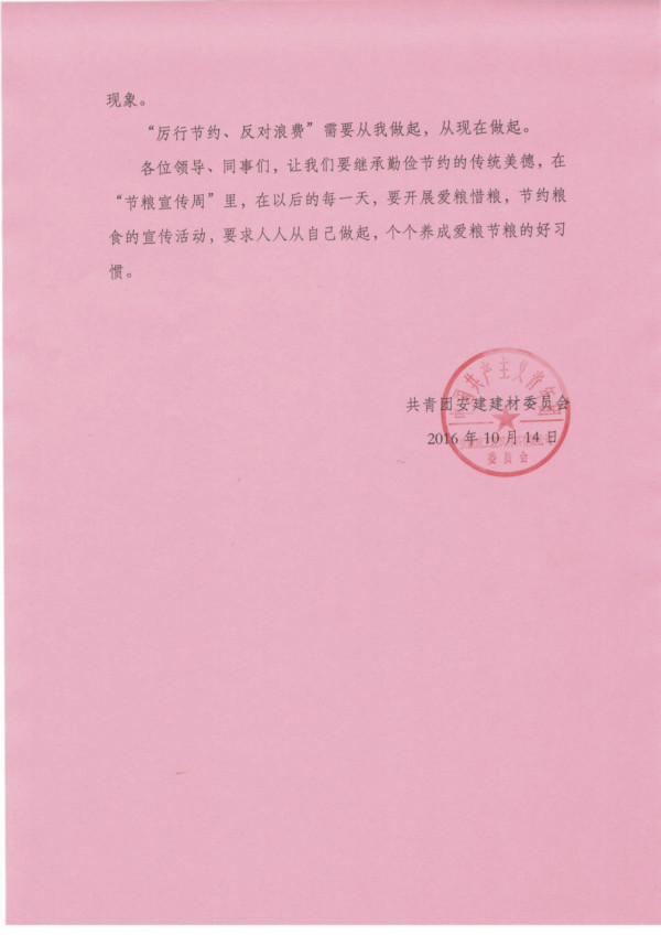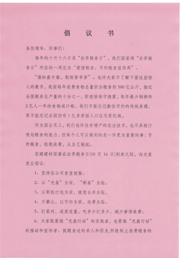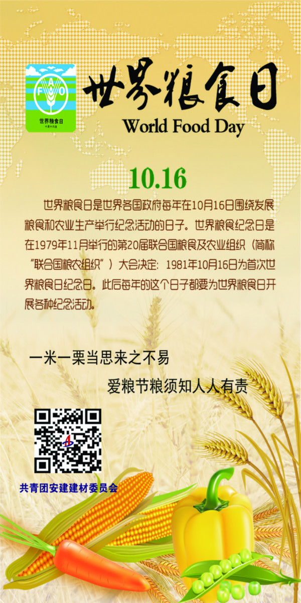 每年的10月16日是世界糧食日,每年世界糧食日所在周為全國(guó)愛惜糧食節(jié)約糧食宣傳周。安建建材團(tuán)委通過(guò)張貼節(jié)糧倡議書、發(fā)放愛糧節(jié)糧宣傳卡片、征集愛糧節(jié)糧宣言等方式廣泛引導(dǎo)、帶動(dòng)全體員工積極參與,大力宣傳愛糧節(jié)糧科學(xué)知識(shí),號(hào)召大家養(yǎng)成居安思危、處豐思歉、惜糧如金、節(jié)糧成習(xí)的良好風(fēng)尚,從我做起、從身邊做起,減少糧食的損失與浪費(fèi)。
