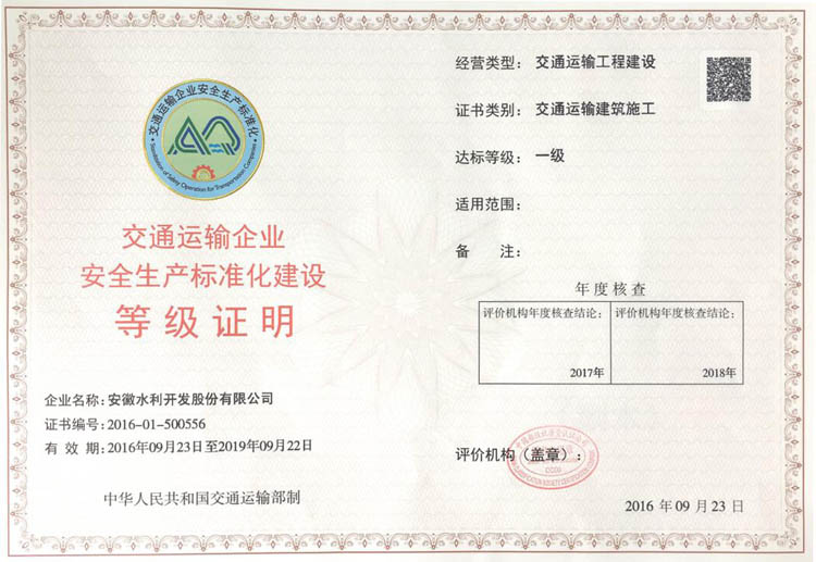 安徽水利自2015年5月份正式啟動交通運輸安全生產(chǎn)標(biāo)準(zhǔn)化一級企業(yè)達(dá)標(biāo)活動以來,在公司各級領(lǐng)導(dǎo)的重視和支持下,由股份公司安全監(jiān)察局牽頭,先后完成公司自評、第三方評審、復(fù)評和交通運輸部現(xiàn)場驗收工作,并最終榮獲交通運輸部交通運輸安全生產(chǎn)標(biāo)準(zhǔn)化一級達(dá)標(biāo)單位。通過標(biāo)準(zhǔn)化達(dá)標(biāo)活動的開展,一定程度上提高了公司的安全管理水平,促進(jìn)了施工現(xiàn)場標(biāo)準(zhǔn)化的實施,為公司生產(chǎn)經(jīng)營和持續(xù)健康發(fā)展奠定了基礎(chǔ)。