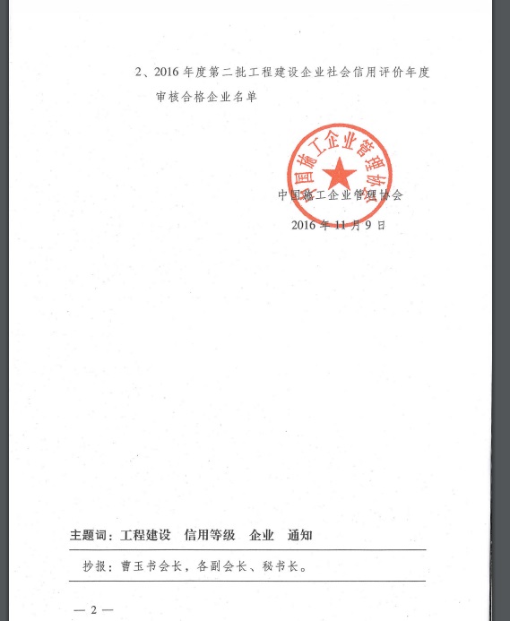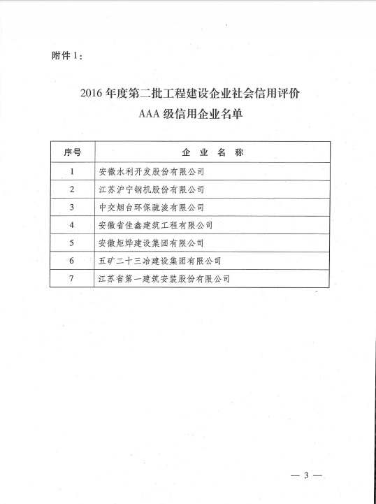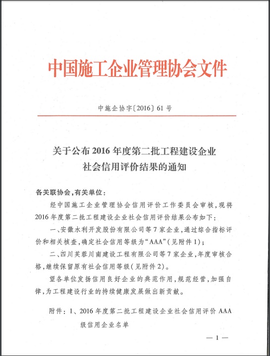經(jīng)中國施工企業(yè)管理協(xié)會信用評價(jià)工作委員會審核,安徽水利開發(fā)股份有限公司被授予2016年度第二批工程建設(shè)企業(yè)社會信用評價(jià)AAA級信用企業(yè)單位。