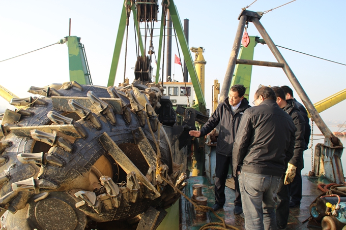 次日一早,戴總一行親臨項目施工現(xiàn)場,登上挖泥船,就3800型挖泥船功率、排泥管跨越鐵路線問題進行分析,并提出有針對性解決措施,幫助、指導(dǎo)項目部解決施工困難。最后,戴總提出三點要求:一是鼓勵技術(shù)人員開動腦筋,用創(chuàng)新思維解決實際難題;二是項目公司要加強與當(dāng)?shù)卣臏贤?,協(xié)調(diào)好拆遷補償及當(dāng)前存在的突出問題;三是項目部要在確保安全的前提下,加快工程進度,早日完成工程量。