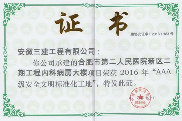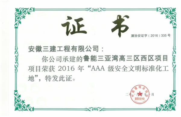 國家“AAA級安全文明標(biāo)準(zhǔn)化工地”是由中國建筑業(yè)協(xié)會建筑安全分會在全國范圍內(nèi)組織開展的大型評選活動,是建設(shè)部批準(zhǔn)的安全生產(chǎn)最高獎項。一次兩個項目獲獎,這標(biāo)志著我公司在安全文明標(biāo)準(zhǔn)化工地建設(shè)上已經(jīng)有了一套自己獨特和較成熟的做法,走在了行業(yè)的前列。