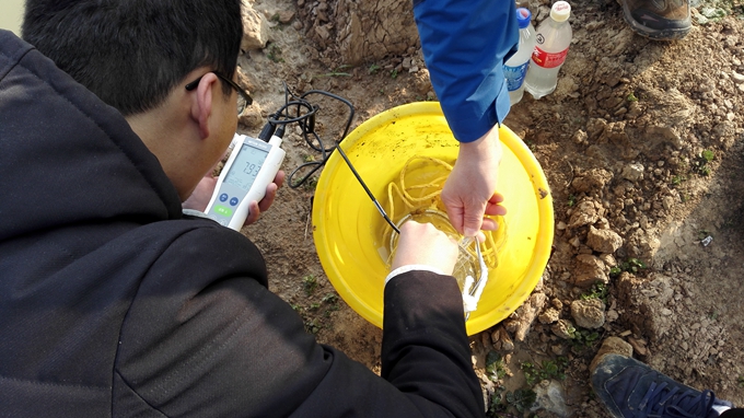 課題組一行在聽取項目概況和有關介紹后,實地察看了中湖地質環(huán)境治理項目(一期、二期)總體控制性詳細規(guī)劃區(qū)域。根據察看結果和背景資料,分析了該科研項目當前緊迫的任務、現(xiàn)場地形地貌和周邊環(huán)境(特別是水系和塌陷區(qū)采空層情況),具體采樣工作包括采集土樣、水樣、沉降觀測點的選擇,并實時檢測了水樣的pH值等基礎指標等。