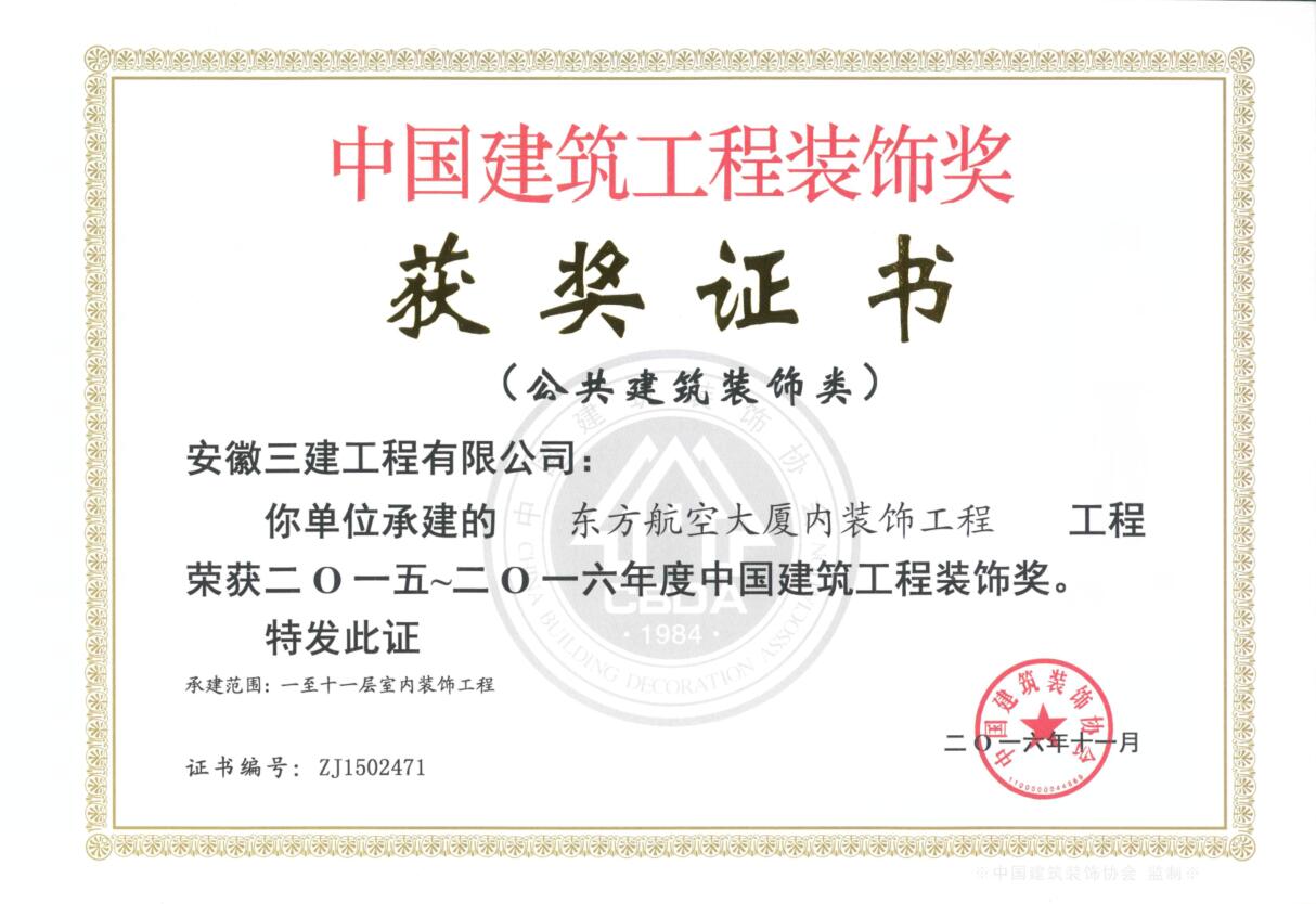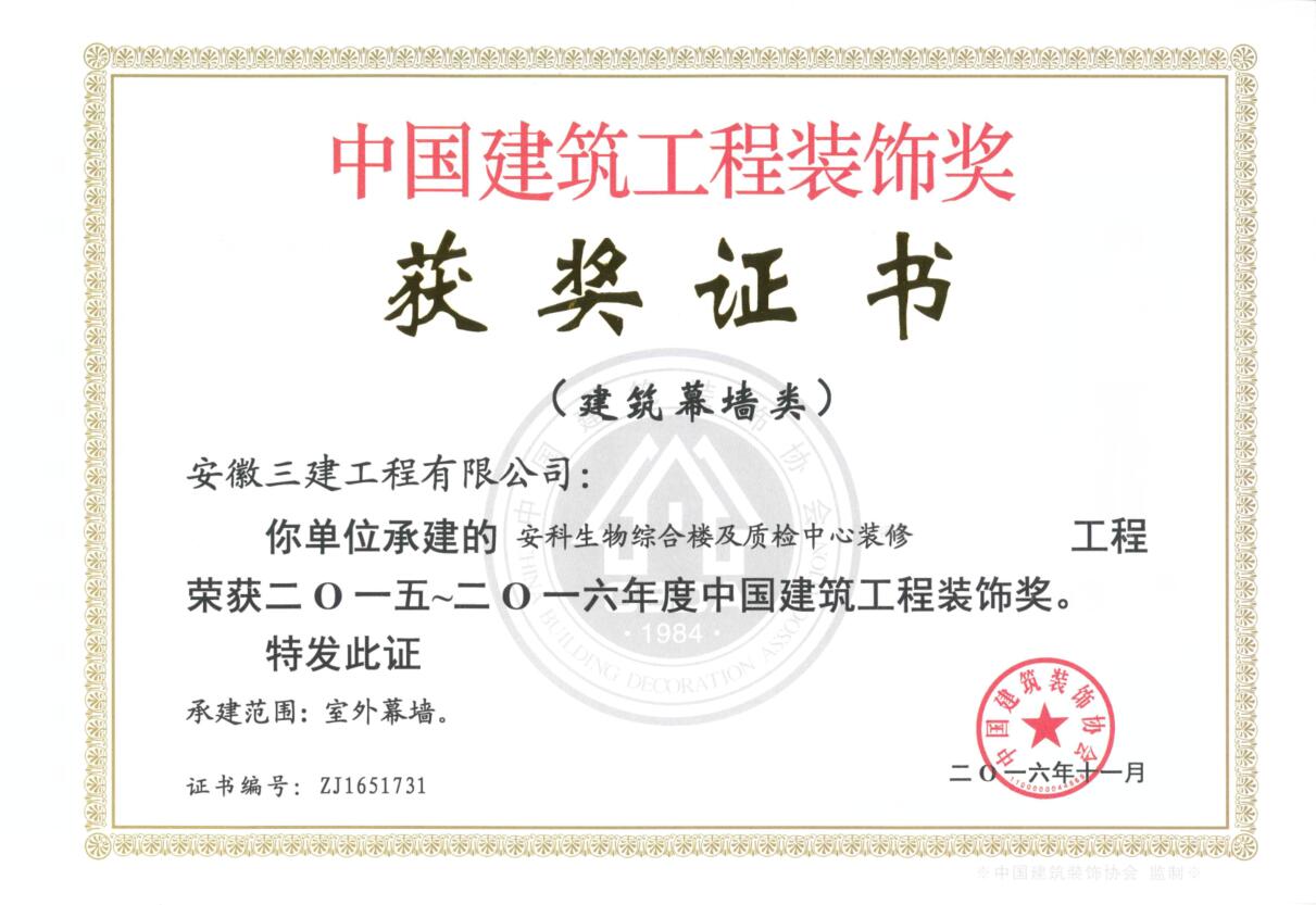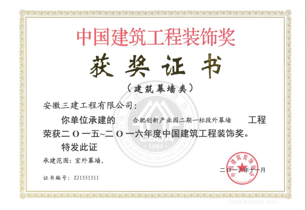 12月23日,由中國建筑裝飾協(xié)會(huì)組織的“2015-2016年度中國建筑工程裝飾獎(jiǎng)”頒獎(jiǎng)大會(huì)在北京國家會(huì)議中心隆重舉行。安徽三建裝飾公司承建的三項(xiàng)工程憑借卓越的設(shè)計(jì)水平和精良的施工質(zhì)量斬獲中國建筑裝飾行業(yè)的最高榮譽(yù)獎(jiǎng)——“中國建筑工程裝飾獎(jiǎng)”。這三項(xiàng)獲獎(jiǎng)工程分別是合肥創(chuàng)新產(chǎn)業(yè)園二期一標(biāo)段外幕墻工程、東方航空大廈內(nèi)裝飾工程及安科生物綜合樓及質(zhì)檢中心裝修工程。