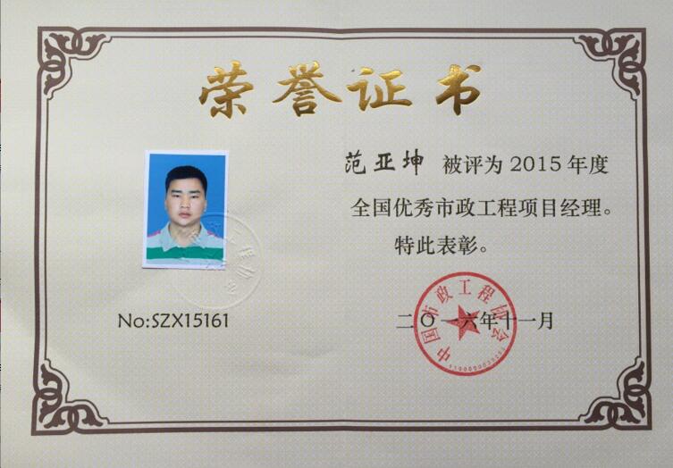 日前,從中國市政工程協(xié)會傳來喜訊,安徽三建市政公司范亞坤同志喜獲“2015年度全國優(yōu)秀市政工程項(xiàng)目經(jīng)理”稱號。