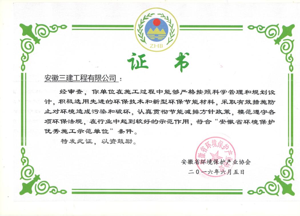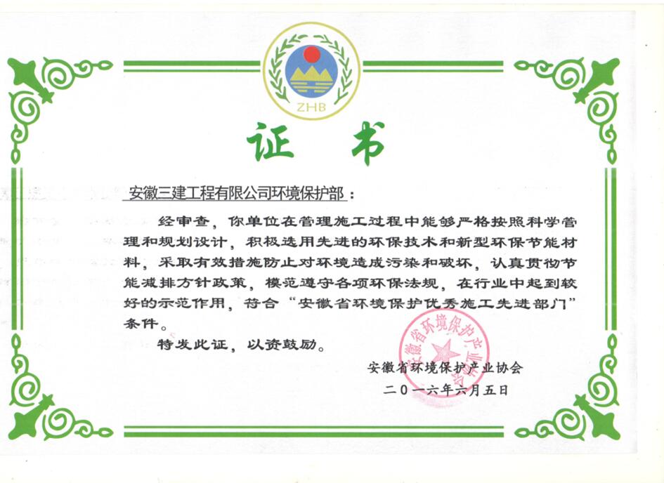 近日,從安徽省環(huán)境保護(hù)產(chǎn)業(yè)協(xié)會獲悉,安徽三建公司榮獲“2016年度安徽省環(huán)保優(yōu)秀施工示范單位”稱號;同時(shí),該司環(huán)境保護(hù)部被評為“安徽省環(huán)境保護(hù)優(yōu)秀施工先進(jìn)部門”。此項(xiàng)榮譽(yù)的獲得,是省環(huán)境保護(hù)協(xié)會對我公司在項(xiàng)目建設(shè)中堅(jiān)持綠色施工、注重環(huán)境保護(hù)工作的充分肯定。
