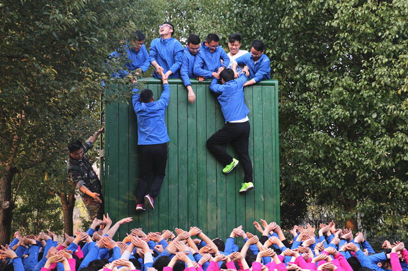 令人印象最深的是本次培訓(xùn)的最后一個項目“畢業(yè)墻”活動,全體130名“受困”員工要在不借助外力的情況下,通過團隊力量,在20分鐘內(nèi)徒手越過4米多高的垂直板墻“脫險”。一開始,許多人都感到信心不足。在張鍵董事長的帶領(lǐng)下,大家聚在一起研究方案,最后決定采用搭建三層人梯、定人定責、下推上拉的方式攀越板墻。“脫困”過程中,安建建材的小伙子們勇于擔當,沖鋒陷陣,以無畏奉獻的精神積極投入到同事的“營救”中,女同胞們在一旁舉起雙手,架起“防護網(wǎng)”,幫忙吶喊助威。困境之中,有勇當開路先鋒的、有甘當人墻的、有負責墊后的……大家團結(jié)協(xié)作、爭先恐后、共克難關(guān),董事長張鍵更是以身作則,默默當起人墻,用堅實的肩膀托舉“遇困”員工翻越高墻,整個場面感人至深。通過高效的團隊協(xié)作、堅定必勝的信心,在短短的17分鐘內(nèi),所有“遇困”員工便被安全“營救”到高墻之外,沒有一名被落下?;顒幼詈?,所有人聚到了一起,看著小伙子們一個個漲紅的臉頰、被踩的印記鮮紅的肩膀,回憶著兩天來的點點滴滴……大家感受到了安建建材公司這個大家庭的溫暖,不禁熱淚盈眶,相擁到了一起、感動到了一起、心擰到了起……