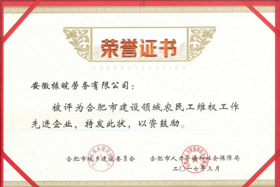 日前,合肥市城鄉(xiāng)建設委員會與合肥市人力資源和社會保障局聯(lián)合發(fā)文,表彰2016年度建設領域農(nóng)民工維權工作突出貢獻單位,安徽三建公司所屬安徽振皖勞務有限公司榮獲合肥市2016年度“建設領域農(nóng)民工維權工作先進企業(yè)”稱號。