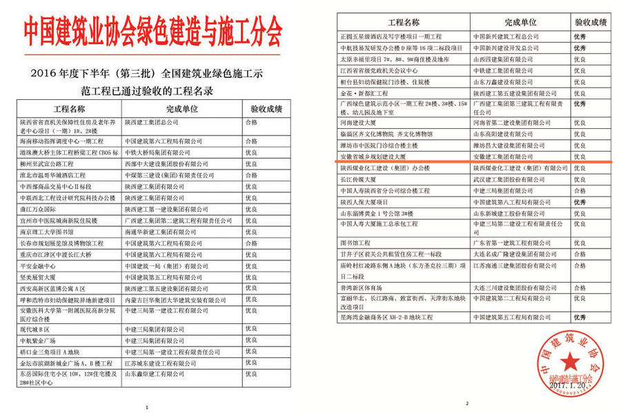 日前,中國建筑業(yè)協(xié)會(huì)綠色建造與施工分會(huì)發(fā)布了2016年度下半年(第三批)全國建筑業(yè)綠色施工示范工程已通過驗(yàn)收的工程名單,我公司承建的安徽省城鄉(xiāng)規(guī)劃建設(shè)大廈工程以優(yōu)良成績順利通過驗(yàn)收。