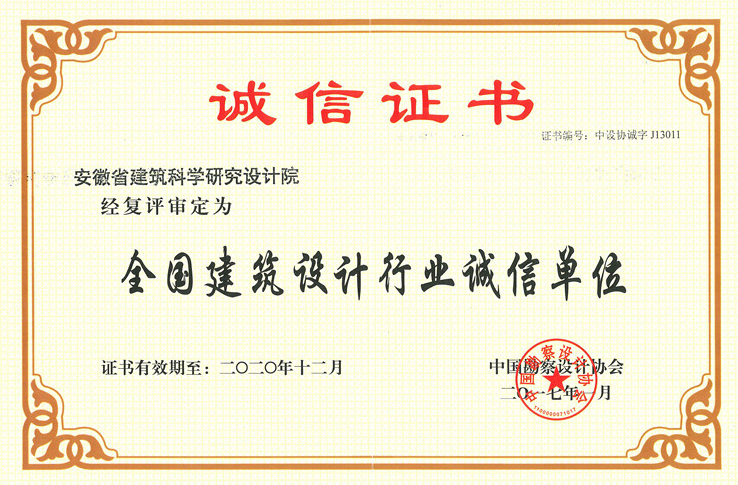 近日,安徽省建科院順利通過中國勘察設(shè)計協(xié)會復(fù)審認(rèn)定,連續(xù)兩次被評為“全國建筑設(shè)計行業(yè)誠信單位”企業(yè)。
