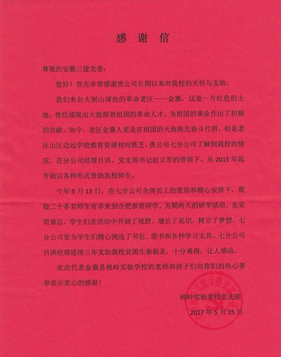 近日,金寨縣桃?guī)X實(shí)驗(yàn)小學(xué)黨支部向安徽三建公司黨委發(fā)來(lái)感謝信,感謝安徽三建七分公司對(duì)先瑞希望小學(xué)的愛(ài)心捐助、無(wú)私貢獻(xiàn)、大愛(ài)無(wú)疆。七公司黨支部連續(xù)兩年在該校開(kāi)展幫扶活動(dòng),七公司經(jīng)理呂洪更是連續(xù)多年資助該校貧困生。