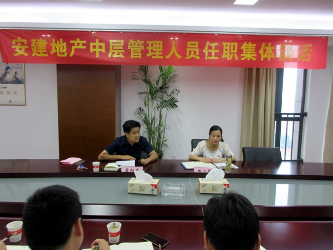 6月5日下午,根據(jù)安建地產(chǎn)黨委安排和《干部任用選拔條例》等相關(guān)規(guī)定,公司組織即將履任新職的13名中層管理人員開展任前廉潔談話,集團(tuán)公司副總經(jīng)理、安建地產(chǎn)黨委書記、董事長(zhǎng)霍向東、安建地產(chǎn)黨委委員、紀(jì)委書記陳小群和相關(guān)人員在公司第二會(huì)議室參加了談話。