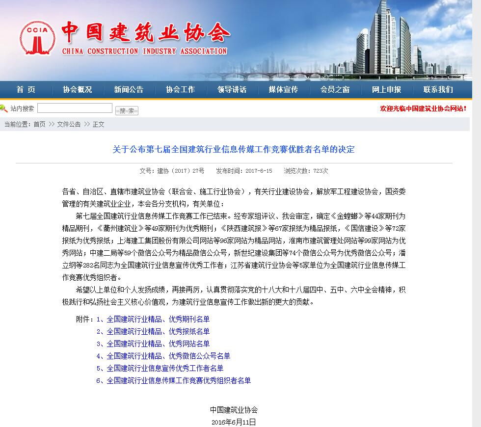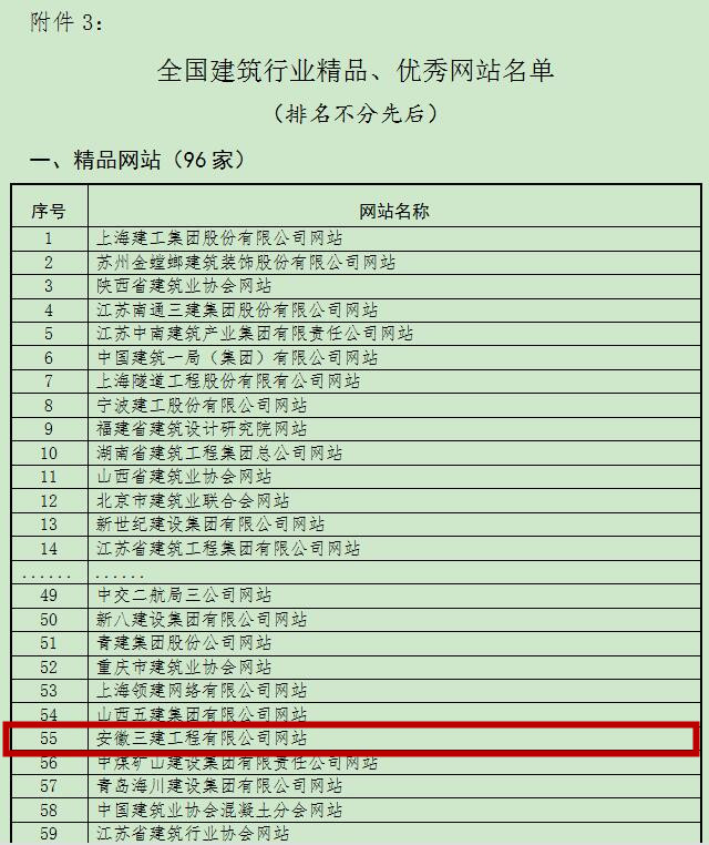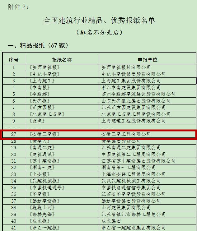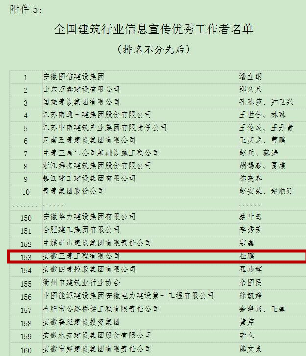 據(jù)悉,該獎項是經(jīng)各市建筑業(yè)協(xié)會推薦,中國建筑業(yè)專家評審會審定,后期將召開表彰會議。此獎項的獲得,標志著安徽三建公司在一年一度的全國建筑行業(yè)信息傳媒工作競賽中奮力趕超,勇創(chuàng)佳績,再攀高峰?!栋不杖▓蟆范嗄戢@此榮譽,公司網(wǎng)站首次獲此殊榮。