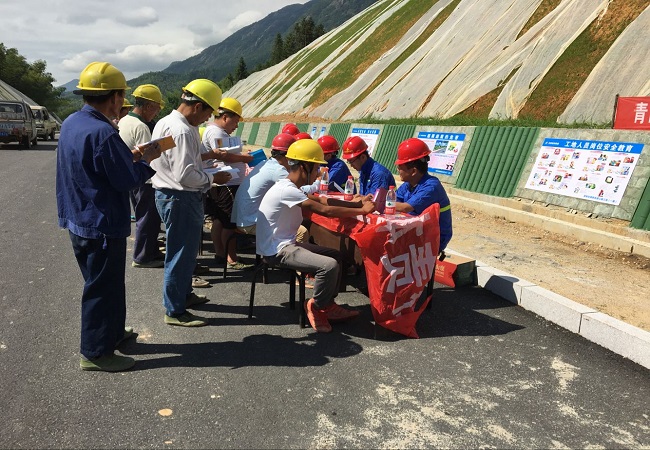 蕪合高速公路改擴(kuò)建三標(biāo)發(fā)放安全宣傳資料,強(qiáng)化一線工人安全意識(shí),解答一線工人提出的有關(guān)安全問(wèn)題。