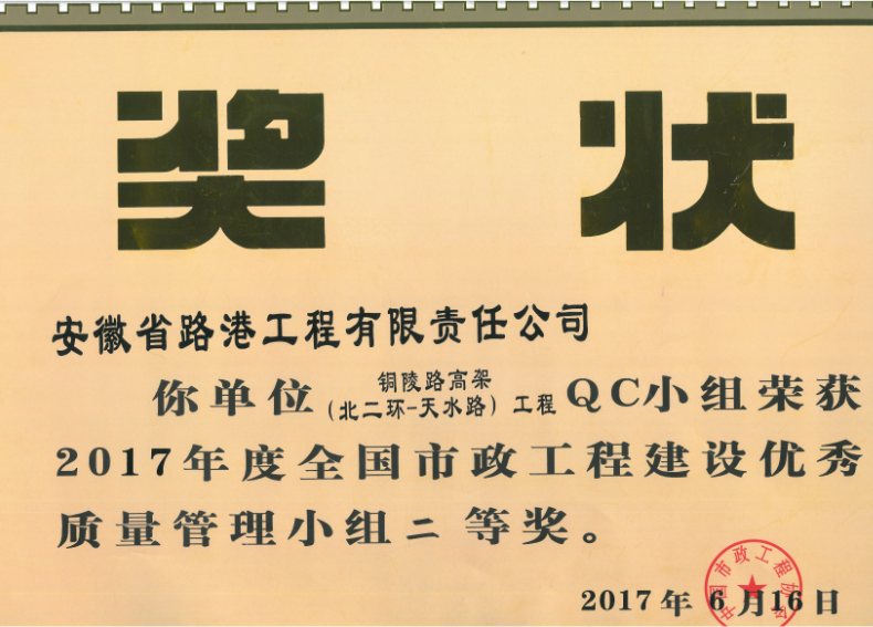 近日,從2017年度全國(guó)市政工程建設(shè)優(yōu)秀質(zhì)量管理QC小組成果發(fā)布總結(jié)表彰大會(huì)現(xiàn)場(chǎng)傳來喜訊,安徽路港合肥市銅陵路高架工程QC小組榮獲本年度全國(guó)市政工程建設(shè)優(yōu)秀質(zhì)量管理小組二等獎(jiǎng)。