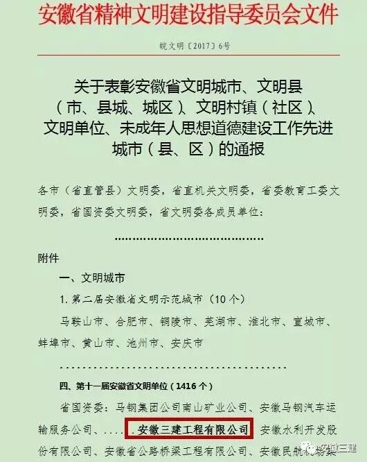 6月20日,安徽省精神文明建設(shè)指導(dǎo)委員會發(fā)布了《關(guān)于表彰安徽省文明城市、文明縣(市、縣城、城區(qū))、文明村鎮(zhèn)(社區(qū))、文明單位、未成年人思想道德建設(shè)工作先進(jìn)城市(縣、區(qū))的通報》(皖文明【2017】6號),安徽三建公司喜獲第十一屆安徽省文明單位榮譽(yù)稱號。這是我公司第五次榮獲“安徽省文明單位”稱號,是公司文明創(chuàng)建工作取得的又一成果。同時,兄弟單位安徽水利、安徽路橋也榜上有名。