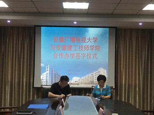2017年7月4日下午,安徽建工技師學院與安徽廣播電視大學簽署繼續(xù)教育合作辦學協(xié)議。安徽廣播電視大學副校長張敏、招生辦主任琚逸云、開放教育學院副院長趙翀,安徽建工技師學院副院長任建設(shè)、繼續(xù)教育處處長蔣先智等共同出席簽署儀式。簽字儀式由任建設(shè)副院長主持。
