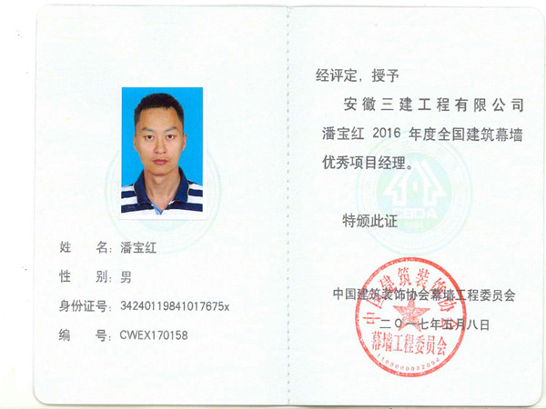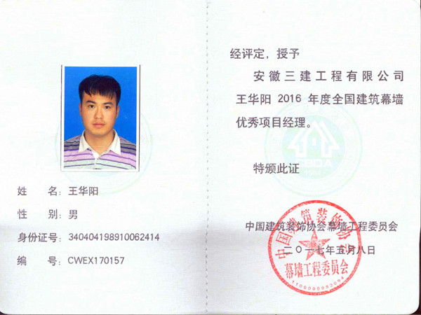 2017年6月在第十屆中國建筑幕墻設(shè)計師大會上,安徽三建裝飾公司王華陽、潘寶紅兩位同志榮獲“2017年中國建筑幕墻優(yōu)秀項目經(jīng)理”稱號。同時安徽省建筑裝飾協(xié)會在其官網(wǎng)上發(fā)布喜訊:該司萬和生、高莉等11名同志榮獲“2015-2016年度安徽省建筑裝飾優(yōu)秀項目經(jīng)理”稱號。
