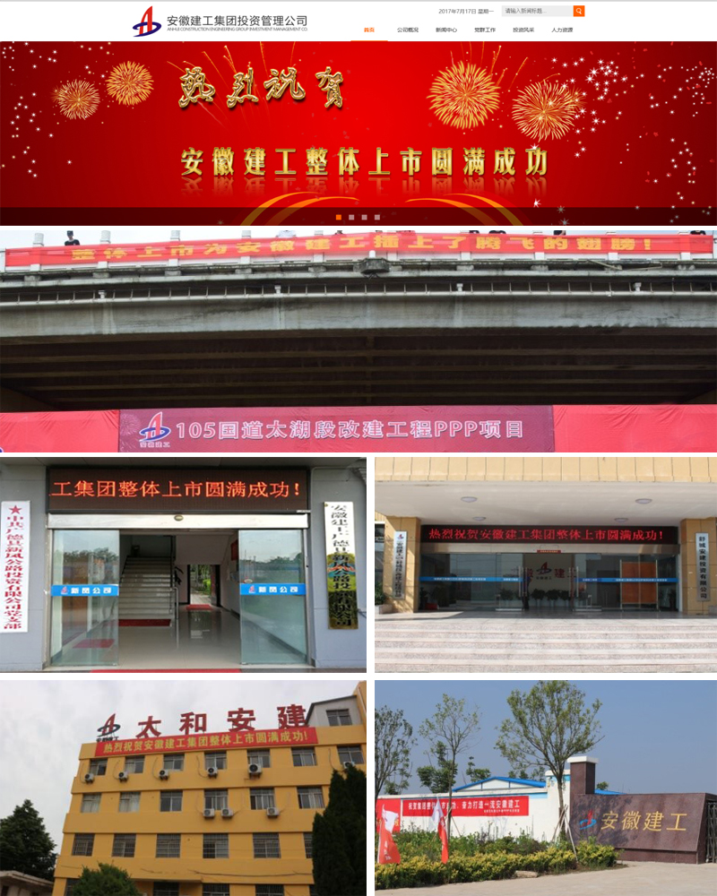 7月3日,安建投資公司網站當即在首頁顯要位置推出集團整體上市消息。各項目公司第一時間組織參建單位進行標語制作和展示,舒城安建、太和安建、廣德新鳳公司在項目公司駐地、施工一線現(xiàn)場通過標語橫幅、LED、電子屏幕、宣傳欄、宣傳櫥窗、宣傳展板等各類媒介渠道進行廣泛宣傳,及時將集團上市信息傳遞到地方政府、主管部門、業(yè)務伙伴和一線施工人員當中。除此之外,淮北安建還在淮北市入城主干道人民路旁懸掛橫幅6條并設置展示宣傳板、電子顯示屏各一塊,擴大宣傳范圍,將宣傳工作落實到實處。