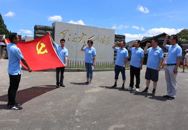 在主席園前,在鮮紅的黨旗下,面對“星星之火,可以燎原”的題詞,公司新入黨的4名黨員右拳高舉,莊嚴宣誓?!拔抑驹讣尤胫袊伯a(chǎn)黨,擁護黨的綱領(lǐng),遵守黨的章程,履行黨員義務(wù),執(zhí)行黨的決定,嚴守黨的紀律,保守黨的秘密,對黨忠誠,積極工作,為共產(chǎn)主義奮斗終身,隨時準備為黨和人民犧牲一切,永不叛黨?!毙曼h員神情嚴肅認真,聲音鏗鏘有力。