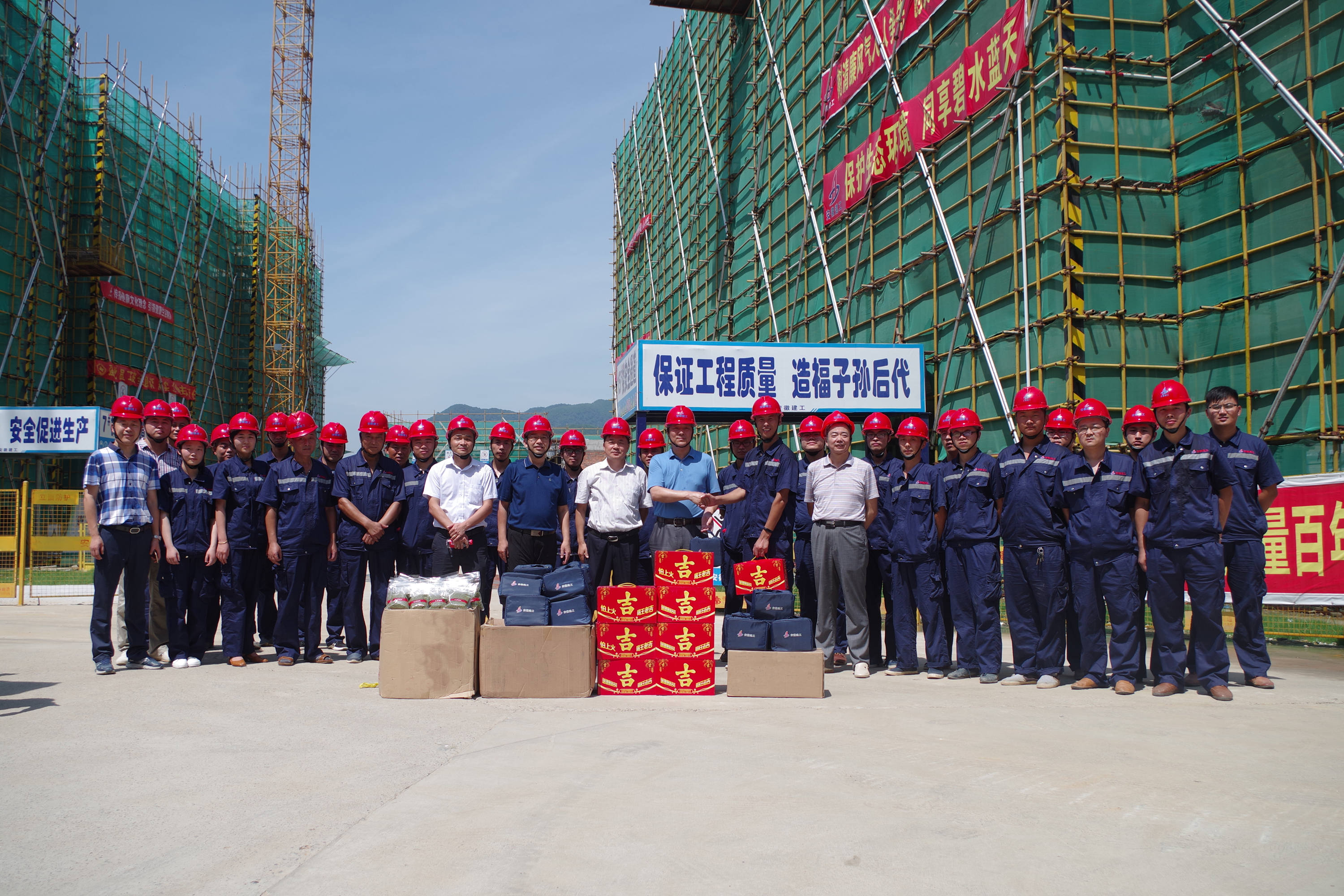 7月16日上午,烈日炎炎,酷暑難當。值涇縣綜合客運樞紐站暨涇縣重大項目集中開工建設之際,安建建設總經(jīng)理、黨委副書記陳傳文,在公司紀委書記、工會主席汪樂生,副總經(jīng)理、總工程師程華旭,副總經(jīng)理張沖的陪同下,來到?jīng)芸h城鎮(zhèn)化建設項目,看望和慰問奮戰(zhàn)在一線的員工,為他們送去綠豆、白糖、毛巾、涼茶、洗漱用品等防暑降溫物品。