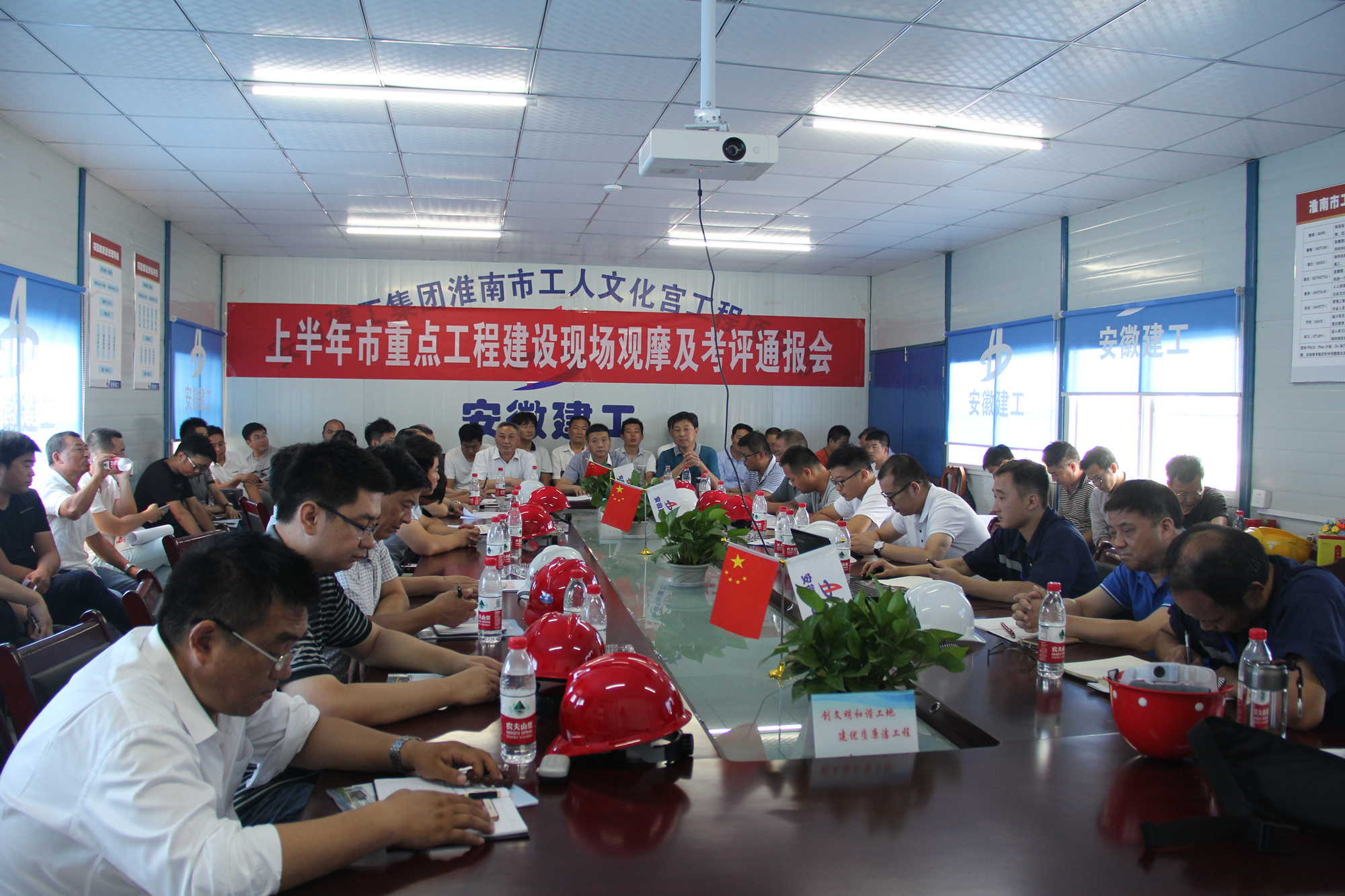 隨后在項(xiàng)目部會(huì)議室,淮南工人文化宮項(xiàng)目管理人員李旭,運(yùn)用PPT材料,詳細(xì)而全面的將工程概況、進(jìn)度、標(biāo)準(zhǔn)化建設(shè)、施工亮點(diǎn)等情況進(jìn)行了匯報(bào)交流。淮南市重點(diǎn)局總工程師洪葉宗首先通報(bào)了上半年考評(píng)打分情況,對(duì)施工管理情況良好的項(xiàng)目進(jìn)行了通報(bào)表?yè)P(yáng),給予了安徽建工承建的文化宮項(xiàng)目在工程進(jìn)度與質(zhì)量、標(biāo)準(zhǔn)化建設(shè)、安全文明施工、揚(yáng)塵治理等方面高度評(píng)價(jià),號(hào)召大家向標(biāo)桿項(xiàng)目學(xué)習(xí)、交流,取長(zhǎng)補(bǔ)短,共同進(jìn)步。