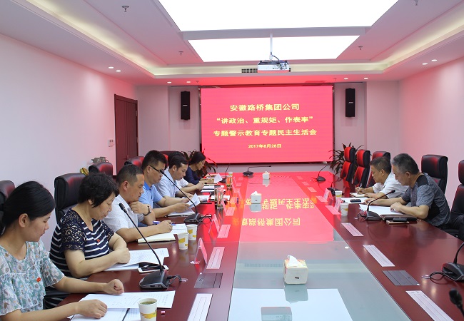 按照集團(tuán)黨委《關(guān)于在推進(jìn)“兩學(xué)一做”學(xué)習(xí)教育常態(tài)化制度化中開展“講政治、重規(guī)矩、作表率”專題教育的實(shí)施方案》部署要求,安徽路橋集團(tuán)于8月28日召開公司領(lǐng)導(dǎo)班子“講政治、重規(guī)矩、作表率”警示教育專題民主生活會(huì),黨委書記、董事長、總經(jīng)理盛明宏主持會(huì)議,公司領(lǐng)導(dǎo)班子全體成員參加會(huì)議。建工集團(tuán)紀(jì)委書記宋志華、紀(jì)委副書記龔志酬到會(huì)指導(dǎo)。