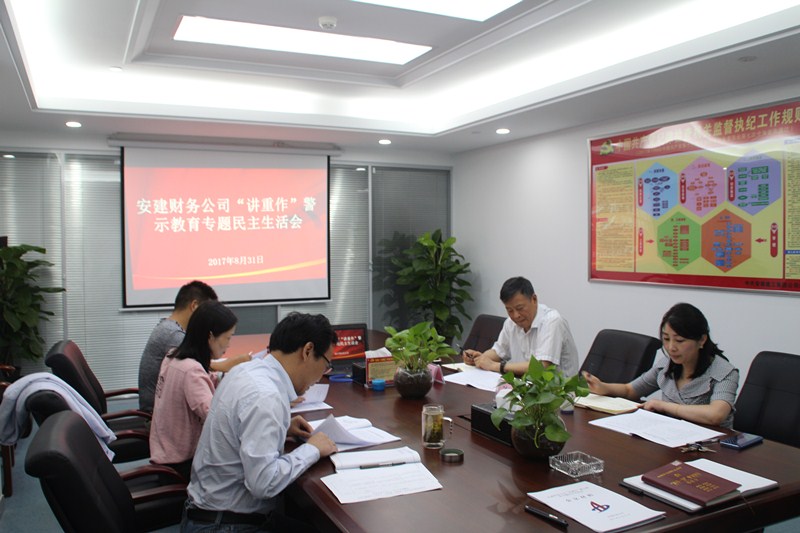 8月31日上午,安建財(cái)務(wù)公司召開(kāi)“講重作”警示教育專題民主生活會(huì)。會(huì)議由公司黨總支書(shū)記、副總經(jīng)理潘琳主持,集團(tuán)公司總會(huì)計(jì)師牛曉峰、紀(jì)委相關(guān)人員到會(huì)指導(dǎo)。