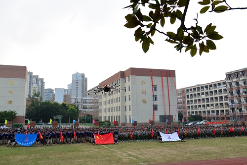在全體起立,齊唱國(guó)歌之后,軍訓(xùn)匯報(bào)表演正式開(kāi)始。匯報(bào)表演科目充滿特色,異彩紛呈。同學(xué)們?cè)诮坦俚目谔?hào)引領(lǐng)下,先后帶來(lái)了隊(duì)列展示、擒敵拳表演、紅旗舞、軍歌大合唱、軍體拳表演、內(nèi)務(wù)整理展示、健美操表演等精彩科目,整齊劃一的隊(duì)列,威武雄壯的吶喊,各個(gè)方陣用最濃烈的激情,以昂揚(yáng)的斗志和雄壯的氣勢(shì)向參會(huì)領(lǐng)導(dǎo)和老師展示了軍事訓(xùn)練的優(yōu)秀成果以及現(xiàn)代技工院校學(xué)子昂揚(yáng)勃發(fā)的精神面貌,贏得了現(xiàn)場(chǎng)陣陣喝彩和掌聲。匯報(bào)表演上還進(jìn)行了精彩絕倫的無(wú)人機(jī)技術(shù)展示,為大家?guī)?lái)了一場(chǎng)視覺(jué)盛宴。