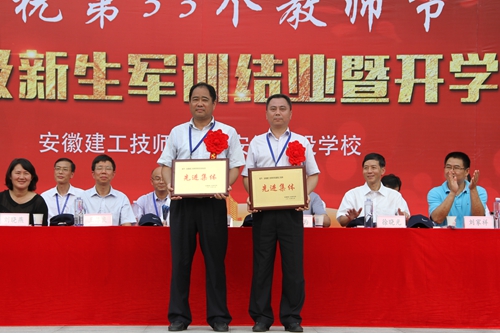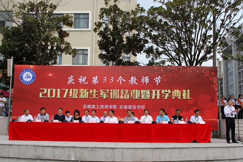 在這秋風(fēng)送爽、丹桂飄香、喜迎黨的十九大勝利召開(kāi)的美好時(shí)節(jié),9月9日下午,正值第33個(gè)教師節(jié)來(lái)臨之際,安徽建工技師學(xué)院2017級(jí)新生軍訓(xùn)結(jié)業(yè)暨開(kāi)學(xué)典禮在田徑運(yùn)動(dòng)場(chǎng)隆重舉行。安徽省人力資源和社會(huì)保障廳副廳長(zhǎng)、黨組成員劉少華,安徽省住房和城鄉(xiāng)建設(shè)廳副巡視員劉少為,安徽省人社廳職業(yè)能力建設(shè)處處長(zhǎng)劉曉燕,安徽省住建廳服務(wù)中心主任劉家祥,安徽省建設(shè)干部學(xué)校校長(zhǎng)、安徽省住建廳執(zhí)業(yè)資格注冊(cè)中心主任楊博,合肥市人社局職業(yè)能力建設(shè)處處長(zhǎng)束志偉,合肥市教育科學(xué)研究院副院長(zhǎng)、合肥市教育局職成處副處長(zhǎng)戈弋,安徽建工集團(tuán)黨委委員、副總經(jīng)理王厚良,安徽建工集團(tuán)工會(huì)主席徐曉光,安徽建工集團(tuán)黨委工作部主任徐文聯(lián),安徽建工集團(tuán)黨委工作部副主任、團(tuán)委書(shū)記王詩(shī)旵等領(lǐng)導(dǎo)嘉賓出席典禮并在主席臺(tái)就座,院領(lǐng)導(dǎo)張衛(wèi)東、任建設(shè)、吳良照、周元清、呂良玉,院長(zhǎng)助理張齊欣、全體教職工、軍事教官及3000余名新生參加典禮。學(xué)院副院長(zhǎng)任建設(shè)主持典禮。