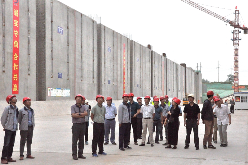 圖為督察組視察澮河南坪船閘主體工程施工情況