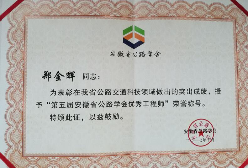 “安徽省公路學(xué)會優(yōu)秀工程師”是我省公路交通行業(yè)科技領(lǐng)域的學(xué)術(shù)和技術(shù)帶頭人,是全省公路交通行業(yè)優(yōu)秀工程技術(shù)人員的代表。