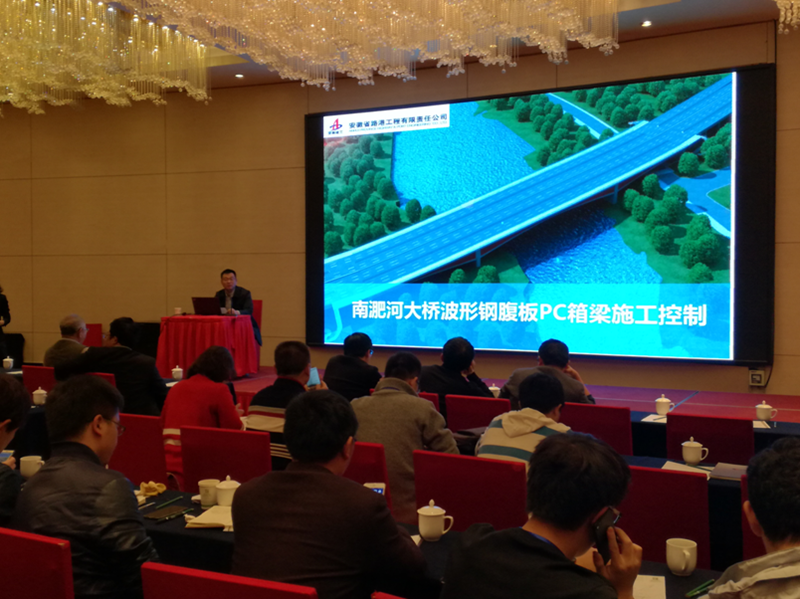 本次會(huì)議以安徽路港公司承建的南淝河大橋?yàn)楣こ瘫尘?,詳?xì)介紹了波形鋼腹板橋梁的概況、發(fā)展與創(chuàng)新、橋梁類型的應(yīng)用技術(shù)、波形鋼腹板生產(chǎn)制造及施工控制等,內(nèi)容豐富,涵蓋全面。安徽路港郎溪路項(xiàng)目部趙家俊作為特邀講師,對南淝河大橋波形鋼腹板PC箱梁的施工控制進(jìn)行了論述,深受與會(huì)人員好評。