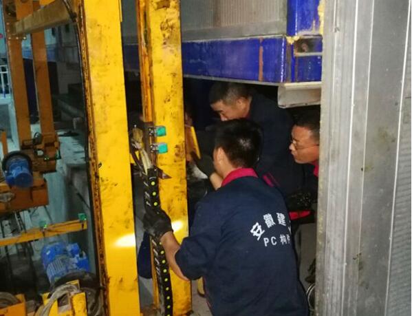國(guó)內(nèi)最大的建筑產(chǎn)業(yè)化住宅項(xiàng)目濱湖“沁園”正在進(jìn)行緊張的吊裝生產(chǎn)中,為確保該項(xiàng)目PC件的及時(shí)供貨,建筑工業(yè)公司采取了歇人不歇機(jī)的輪班作業(yè)方式,日夜加班趕制構(gòu)件產(chǎn)品,確保施工現(xiàn)場(chǎng)進(jìn)度。然而,11月10日晚19:00左右,4#內(nèi)墻板生產(chǎn)線的關(guān)鍵設(shè)備碼垛機(jī)因超負(fù)荷突然發(fā)生故障,順暢的流水線出現(xiàn)了停滯。面對(duì)突如其來(lái)的故障,工業(yè)公司立即行動(dòng),組織力量,僅用了3小時(shí),順利排除故障,確保了沁園項(xiàng)目的按時(shí)供貨,充分體現(xiàn)了安徽三建“雷厲風(fēng)行 真抓實(shí)干”的企業(yè)作風(fēng)。