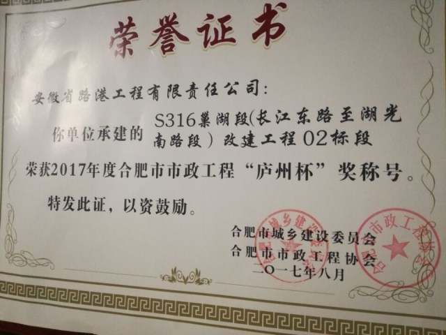 11月16日,從合肥市市政工程協(xié)會(huì)傳來(lái)喜訊,安徽路港承建的S316巢湖段(長(zhǎng)江東路至湖光南路)改建工程02標(biāo)段喜獲2017年度合肥市市政工程“廬州杯”獎(jiǎng)。