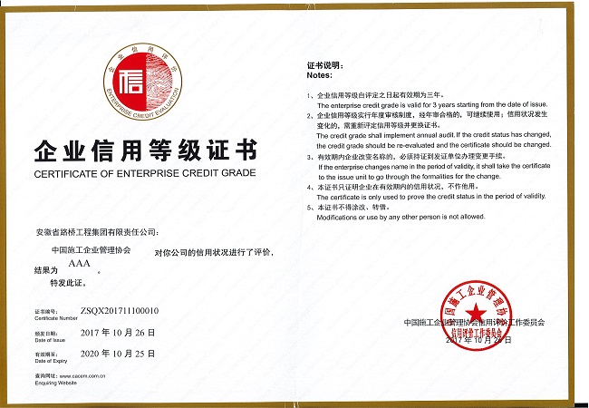 11月23日,中國(guó)施工企業(yè)管理協(xié)會(huì)于北京召開2017年工程建設(shè)誠(chéng)信企業(yè)推薦大會(huì)。會(huì)上公布表彰了工程建設(shè)誠(chéng)信典企型業(yè)和AAA信用等級(jí)企業(yè),并進(jìn)行現(xiàn)場(chǎng)授牌。路橋集團(tuán)獲得AAA級(jí)企業(yè)信用等級(jí),被評(píng)為AAA級(jí)信用企業(yè)。