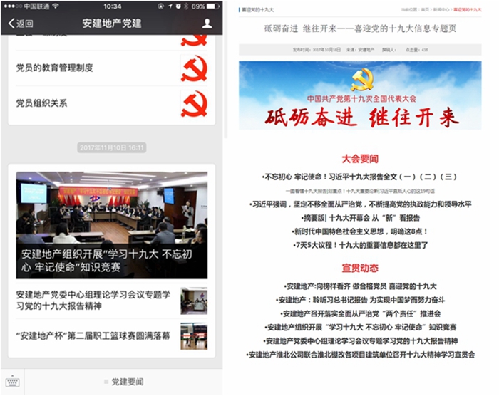 十九大召開(kāi)以來(lái),安建地產(chǎn)黨委充分利用官方網(wǎng)站、微信公眾號(hào)等平臺(tái)全方位立體化解讀黨的十九精神,積極開(kāi)展黨的十九精神宣傳活動(dòng),并統(tǒng)一設(shè)計(jì)了十九大精神宣傳展板,各支部積極踴躍響應(yīng)參與,共同推動(dòng)黨的十九大精神進(jìn)機(jī)關(guān)、進(jìn)項(xiàng)目一線,營(yíng)造出濃厚的十九大精神學(xué)習(xí)宣傳氛圍。