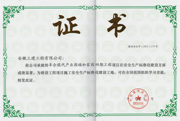 近期,從中國建筑業(yè)協(xié)會建筑安全分會2017年年會暨理事會上傳來消息,安徽三建承建的惠而浦工業(yè)園惠而浦總部及研發(fā)中心項(xiàng)目、阜陽福和家園四期項(xiàng)目榮獲中國“建設(shè)工程項(xiàng)目施工安全生產(chǎn)標(biāo)準(zhǔn)化建設(shè)工地”稱號。其中,阜陽福和家園四期項(xiàng)目獲獎實(shí)現(xiàn)了阜陽市在該獎項(xiàng)上的零突破。截至目前,安徽三建公司共有16個項(xiàng)目獲此殊榮。