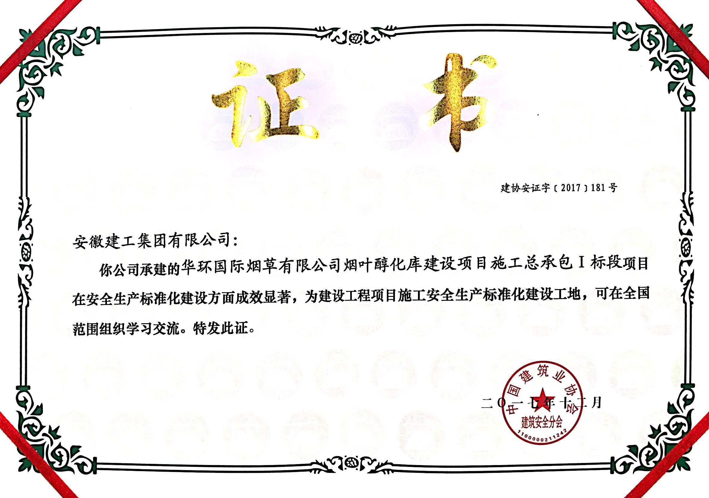近日,從中國建筑業(yè)協(xié)會建筑安全分會2017年年會暨理事會上獲悉,安建建設(shè)承建的華環(huán)煙草醇化庫I標(biāo)段項目被評為全國“建設(shè)工程項目施工安全生產(chǎn)標(biāo)準(zhǔn)化建設(shè)工地”。