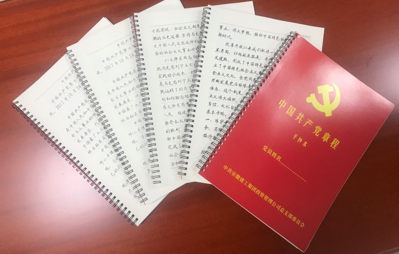 為豐富學(xué)習(xí)貫徹黨的十九大精神學(xué)習(xí)教育形式,促進(jìn)廣大黨員對(duì)黨章、黨規(guī)入腦入心,安建投資公司主動(dòng)謀劃,近日,在所屬各黨支部全體黨員中開展“我的黨章我的黨”系列活動(dòng),通過手抄黨章、黨的十九大報(bào)告暨新黨章測(cè)試等形式,把精讀報(bào)告、深學(xué)黨章、學(xué)習(xí)領(lǐng)會(huì)和自身實(shí)際情況結(jié)合起來,真正學(xué)到精髓、學(xué)出效果。