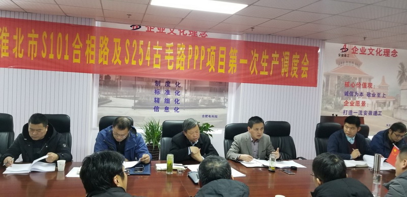 1月4日,淮北市S101合相路及S254古毛路PPP項目召開首次生產(chǎn)調(diào)度會,全力推動該項目建設(shè)管理工作。會議由安建投資公司副總經(jīng)理、淮北安建交通建設(shè)有限公司董事長黃國平主持,淮北市交通運輸局副局長李文才及相關(guān)局領(lǐng)導應(yīng)邀出席?;幢卑步ń煌ńㄔO(shè)有限公司總經(jīng)理周忠、項目公司各部門、設(shè)計單位、施工單位、監(jiān)理單位等各參建單位負責人參加會議。