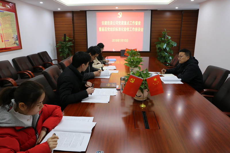 為進(jìn)一步強(qiáng)化黨建工作落實(shí),深入了解基層黨建工作進(jìn)展,11月10日至11日,安建投資公司對(duì)2017年度黨建重點(diǎn)工作進(jìn)行了集中督查,對(duì)基層黨組織標(biāo)準(zhǔn)化建設(shè)工作進(jìn)行了督查驗(yàn)收。公司黨總支書記、副總經(jīng)理余志剛出席座談會(huì)。