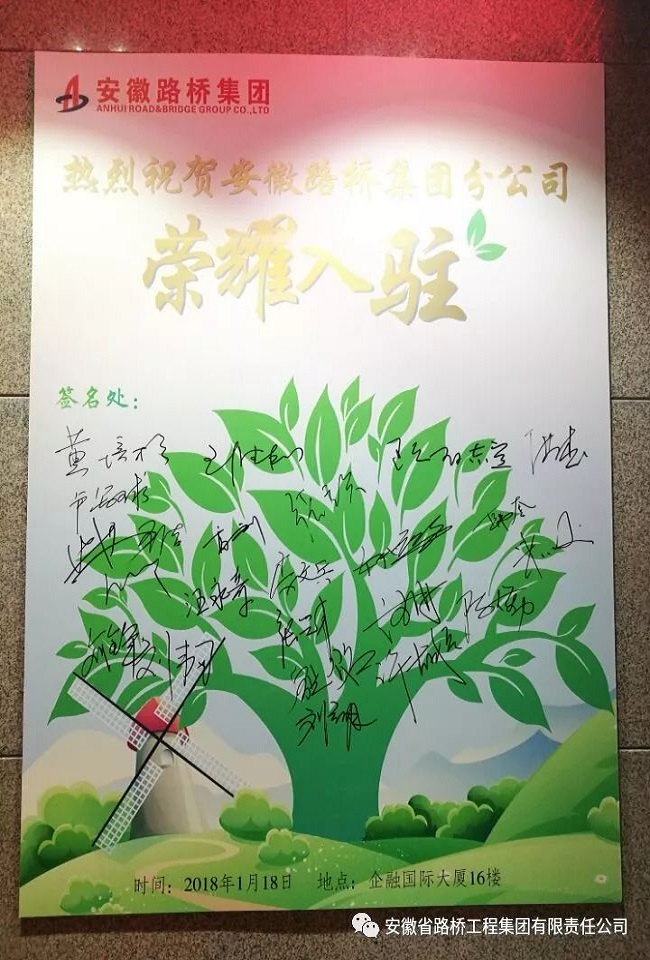 2018年1月18日上午8時(shí)38分,在一片喜慶熱鬧的氣氛中,安徽路橋集團(tuán)分公司入駐儀式在企融國際16樓舉行。路橋集團(tuán)領(lǐng)導(dǎo)班子部分成員、各分公司領(lǐng)導(dǎo)班子等參加儀式。