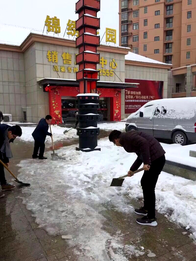 大雪紛飛至,除雪暖意濃。為方便市民出行,保障項(xiàng)目來(lái)訪客戶安全,安建地產(chǎn)瑤海公司全體員工眾志成城,全力以赴防雪除雪。零下的低溫,紛飛的大雪,除雪工作更加艱難,員工手臉被凍的通紅,但絲毫沒(méi)有削減大家高漲的熱情。貼心的防雪,高效的除雪,團(tuán)結(jié)的力量,讓整個(gè)項(xiàng)目暖意洋洋。