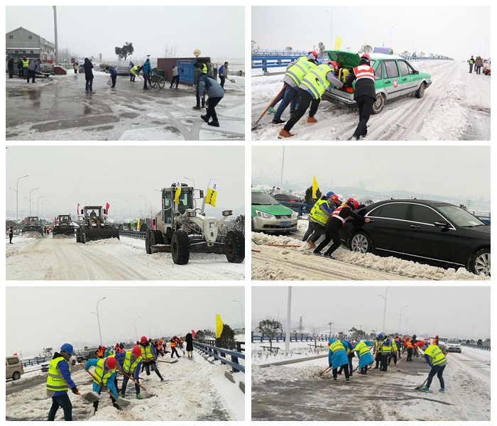 S332安慶至望江改建三標(biāo)項(xiàng)目部職工和班組人員按照大雪前專題會(huì)議要求,將項(xiàng)目駐地、后場(chǎng)料倉(cāng)和施工現(xiàn)場(chǎng)的積雪及時(shí)清除。在得知連接安慶市至望江縣的皖河大橋存在積雪嚴(yán)重的情況后,項(xiàng)目部召開(kāi)緊急會(huì)議,安排項(xiàng)目部職工和機(jī)械設(shè)備前往皖河大橋開(kāi)展義務(wù)除雪活動(dòng)。發(fā)現(xiàn)過(guò)往車輛存在打滑無(wú)法的行走的情況時(shí),大家主動(dòng)上前推車,過(guò)往司機(jī)紛紛豎起大拇指。