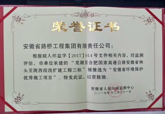 近日,我公司承建的蕪合高速改擴(kuò)建03標(biāo)項(xiàng)目部在安徽省人民環(huán)境監(jiān)測(cè)中心開(kāi)展的2017年度評(píng)選中,喜獲“安徽省環(huán)境保護(hù)優(yōu)秀施工項(xiàng)目”榮譽(yù)。