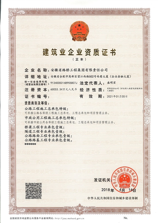 近日,住建部公布《關(guān)于核準2018年度第三批建設(shè)工程企業(yè)資質(zhì)名單》,安徽路橋集團成功晉升公路工程施工總承包特級資質(zhì),同時獲得公路行業(yè)甲級設(shè)計資質(zhì)。繼市政公用工程施工總承包特級資質(zhì)及市政行業(yè)甲級設(shè)計資質(zhì)申報成功后,安徽路橋集團資質(zhì)升級工作再獲豐收,成為安徽省內(nèi)首家擁有市政、公路“雙特雙甲”資質(zhì)企業(yè),也成為全國為數(shù)不多的公路、市政總承包雙特級資質(zhì)企業(yè)!