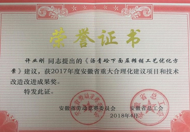 日前安徽省在慶祝“五一”暨“當(dāng)好主人翁、建功新時(shí)代”勞動(dòng)競(jìng)賽推進(jìn)大會(huì)上,對(duì)勞動(dòng)競(jìng)賽先進(jìn)集體和先進(jìn)個(gè)人進(jìn)行了表彰頒獎(jiǎng)。我公司審計(jì)核算部許業(yè)剛同志提出的《瀝青砼下面層攤鋪工藝優(yōu)化方案》榮獲安徽省重大合理化建議項(xiàng)目和技術(shù)改造改進(jìn)成果獎(jiǎng)。
