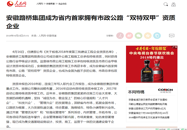 4月23日,人民網(wǎng)在安徽頻道名企動態(tài)模塊,以題為《安徽路橋集團成為省內(nèi)首家擁有市政公路雙特雙甲資質(zhì)企業(yè)》長篇幅報道公司抓住建筑企業(yè)變革和發(fā)展的機遇期,優(yōu)化管理,開展特級資質(zhì)申報等工作情況。